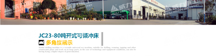 JC23-80吨开式可倾冲床是山东威力重工机床有限公司采用国标工艺标准设计生产的冲压式压力机,机身可以根据工作需求进行倾斜,其结构特点是:机身是用高强度铸铁制造,动力系统采用单盘气动块式摩擦离合器和制动器,接合平稳,磨损小,无故障使用寿命远高于同类产品。滑块带有压塌式保险装置,当机床超载时,保险器首先被压塌,从而保证了整机不受损坏。